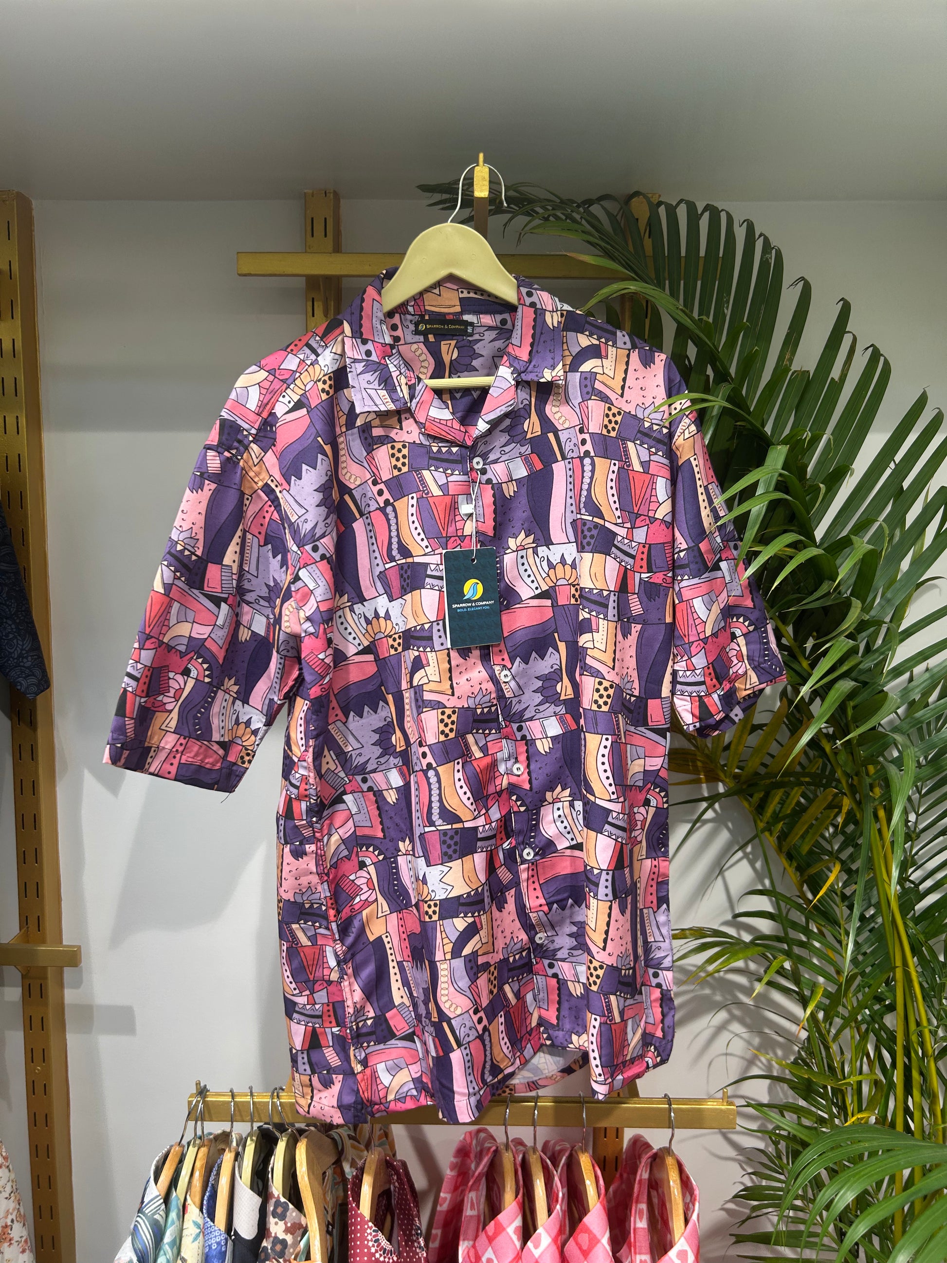 Unleash your creative expression with the Abstract Mosaic Print Shirt, a dynamic fusion of geometric shapes, abstract patterns, and artistic textures. Featuring a vivid mix of pink, purple, peach, and black tones, this half-sleeve Cuban collar shirt brings a unique art-inspired aesthetic to your wardrobe. Crafted from lightweight, breathable cotton, it ensures comfort while making a bold style statement.