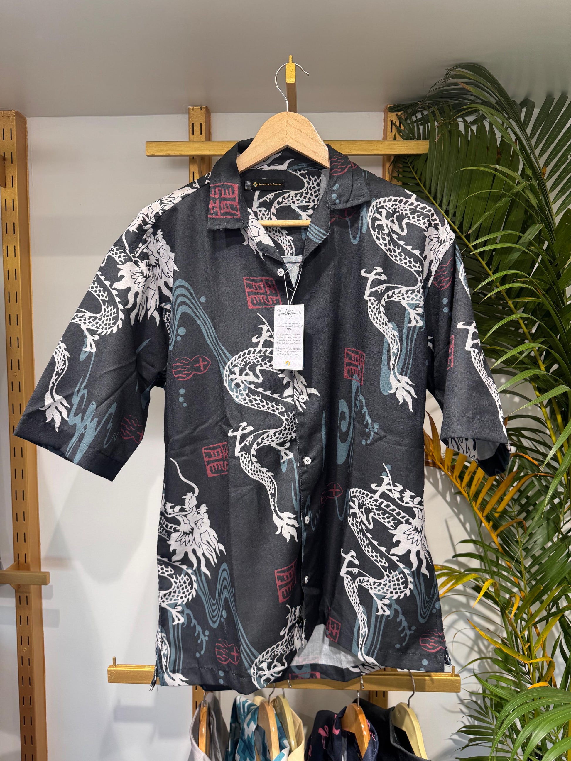 Command attention with the Black Dragon Print Shirt, a statement piece that embodies strength, power, and timeless style. Featuring intricate white dragons against a deep black base, accented with traditional red and blue symbols, this half-sleeve Cuban collar shirt merges Eastern mythology with contemporary street style. Made from lightweight, breathable cotton, it ensures comfort while making an unforgettable impact.