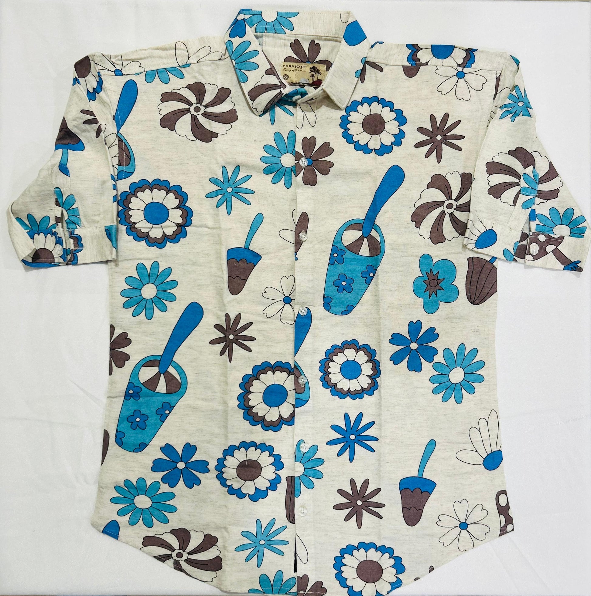 A fresh take on florals, this shirt features a similar playful design to "Retro Bloom" but in a calming blue and brown color palette. The cool tones make it a perfect pick for a beachside getaway or a relaxed casual day. The all-over print includes flowers, popsicle sticks, and abstract elements that add a quirky yet stylish look. Crafted from a lightweight, breathable fabric, it keeps you cool even in warm weather.
