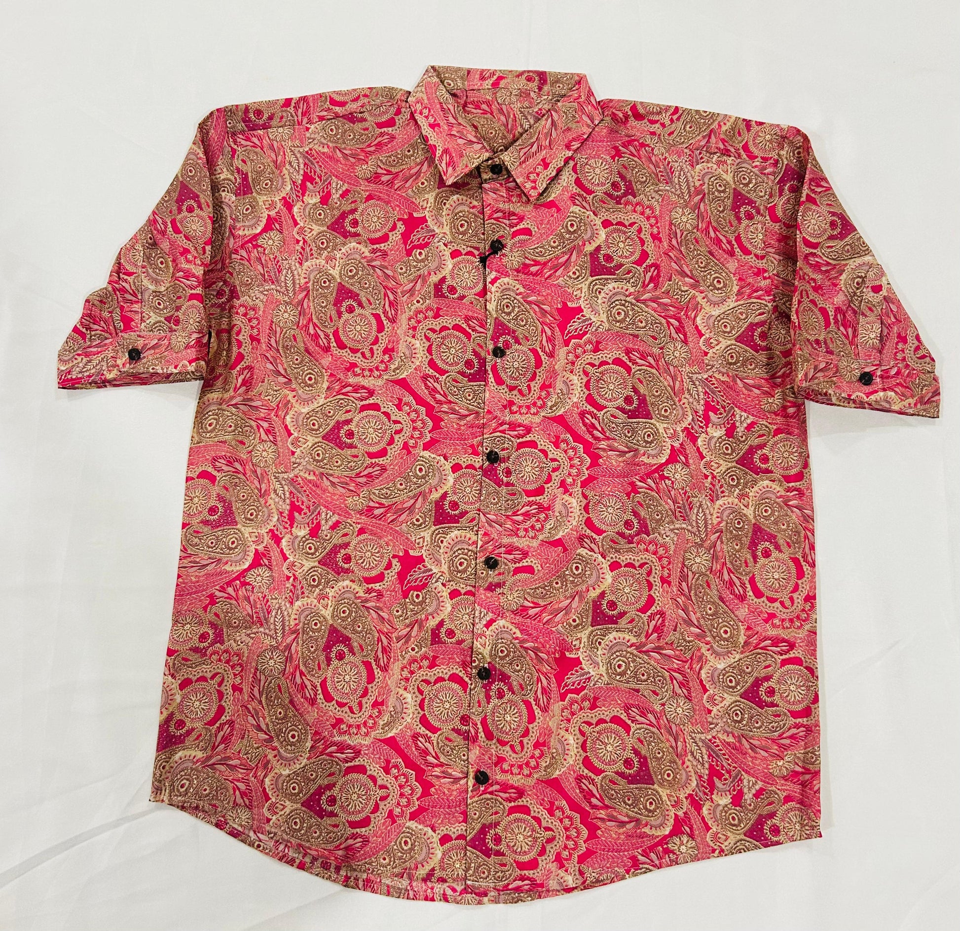 A luxurious and vibrant fusion of traditional paisley artistry and modern fashion, the Crimson Royale shirt is designed for men who love to make an impression. The rich red base is adorned with intricate golden paisley and floral motifs, creating a regal aesthetic that is both eye-catching and sophisticated. The fine details in the patterns give it an elegant, handcrafted appeal, making it a perfect choice for festive occasions, cultural gatherings, or evening wear.