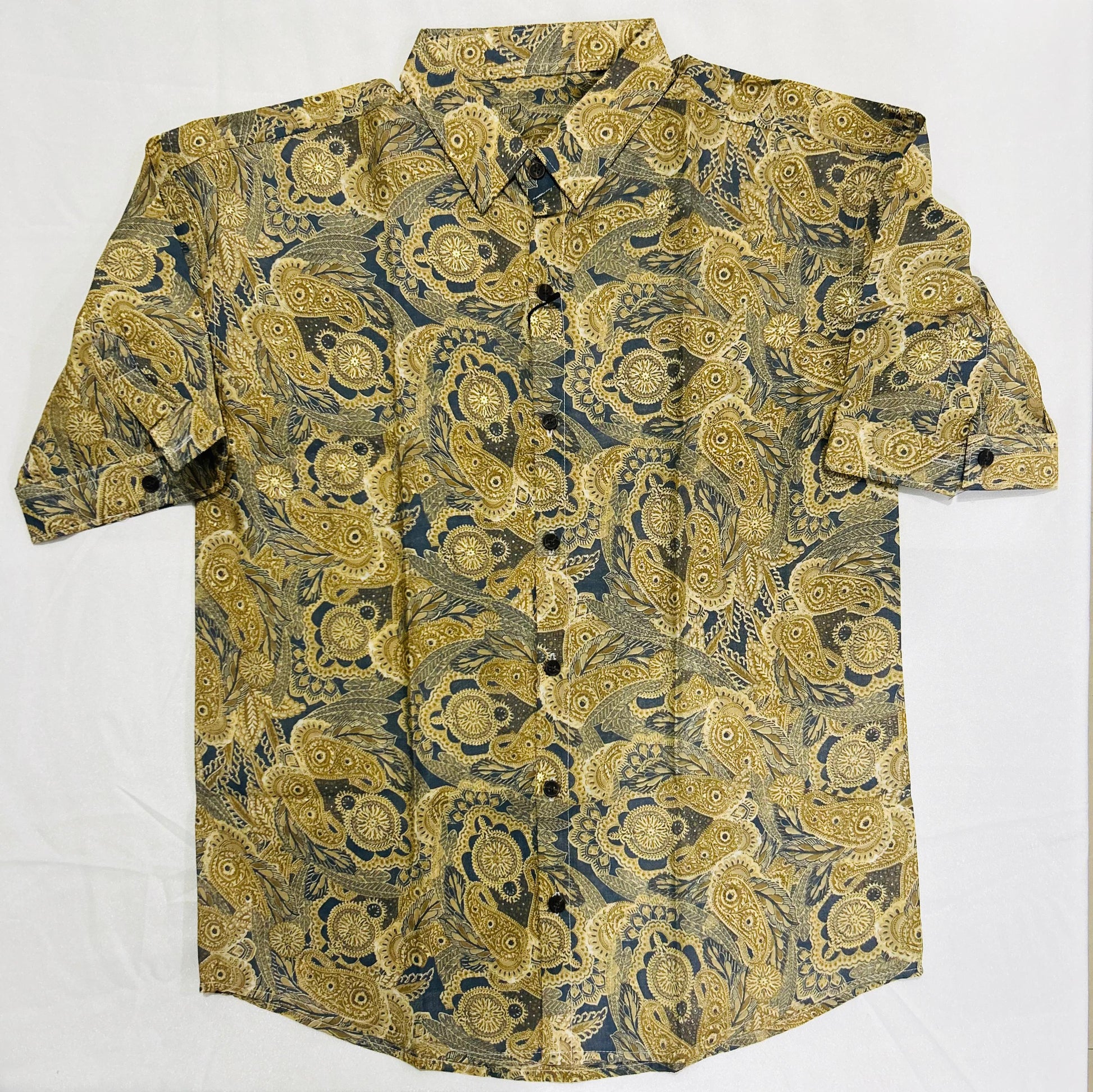 An elegant fusion of tradition and modern style, this shirt features an intricate golden paisley print over a deep navy blue base. The swirling, detailed patterns add a luxurious, regal feel, making it perfect for festive occasions, cultural events, or stylish evening wear. The dark contrasting tones add depth, while the breathable fabric ensures all-day comfort. Pair it with formal trousers for a refined look or dress it down with denim for a bold casual style.