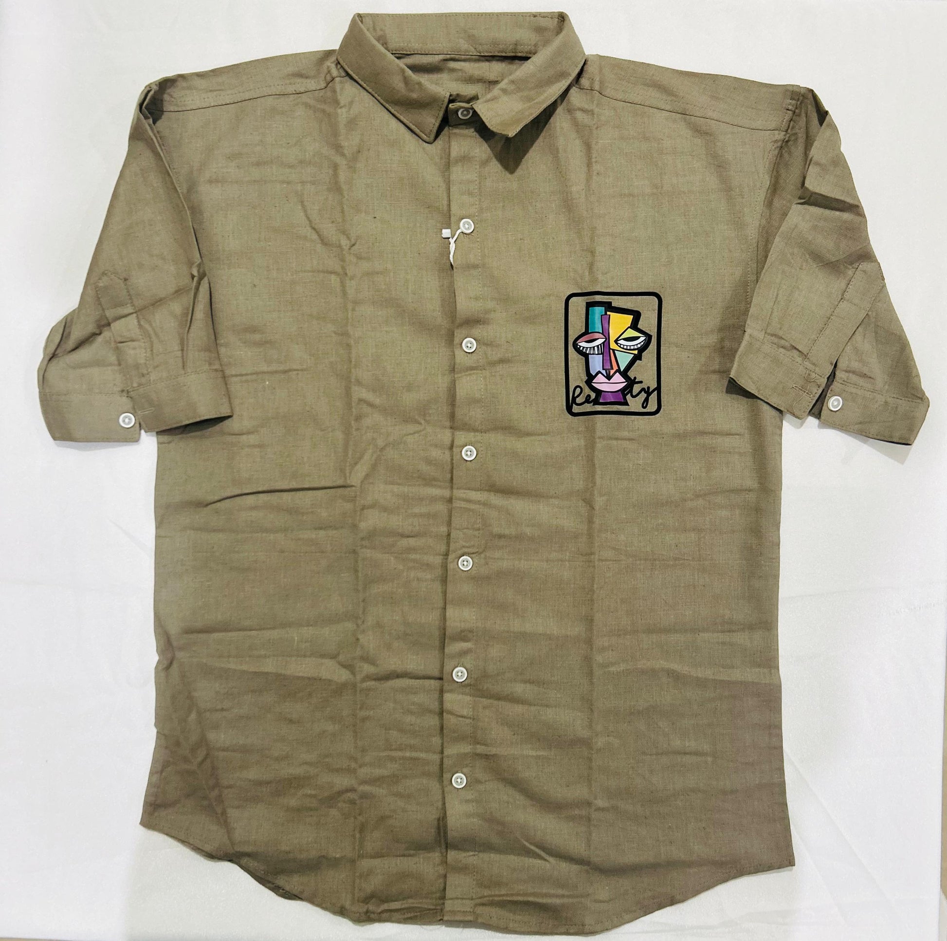 Simplicity meets artistic expression with this earthy-toned olive green shirt. Featuring a single embroidered patch on the chest depicting an abstract modernist face design, it adds a touch of artistic personality to an otherwise classic silhouette. The rich color enhances the sophisticated appeal, making it suitable for casual and semi-formal occasions. The premium linen-cotton blend ensures breathability and comfort, while the crisp collar and structured fit add to its refined look.
