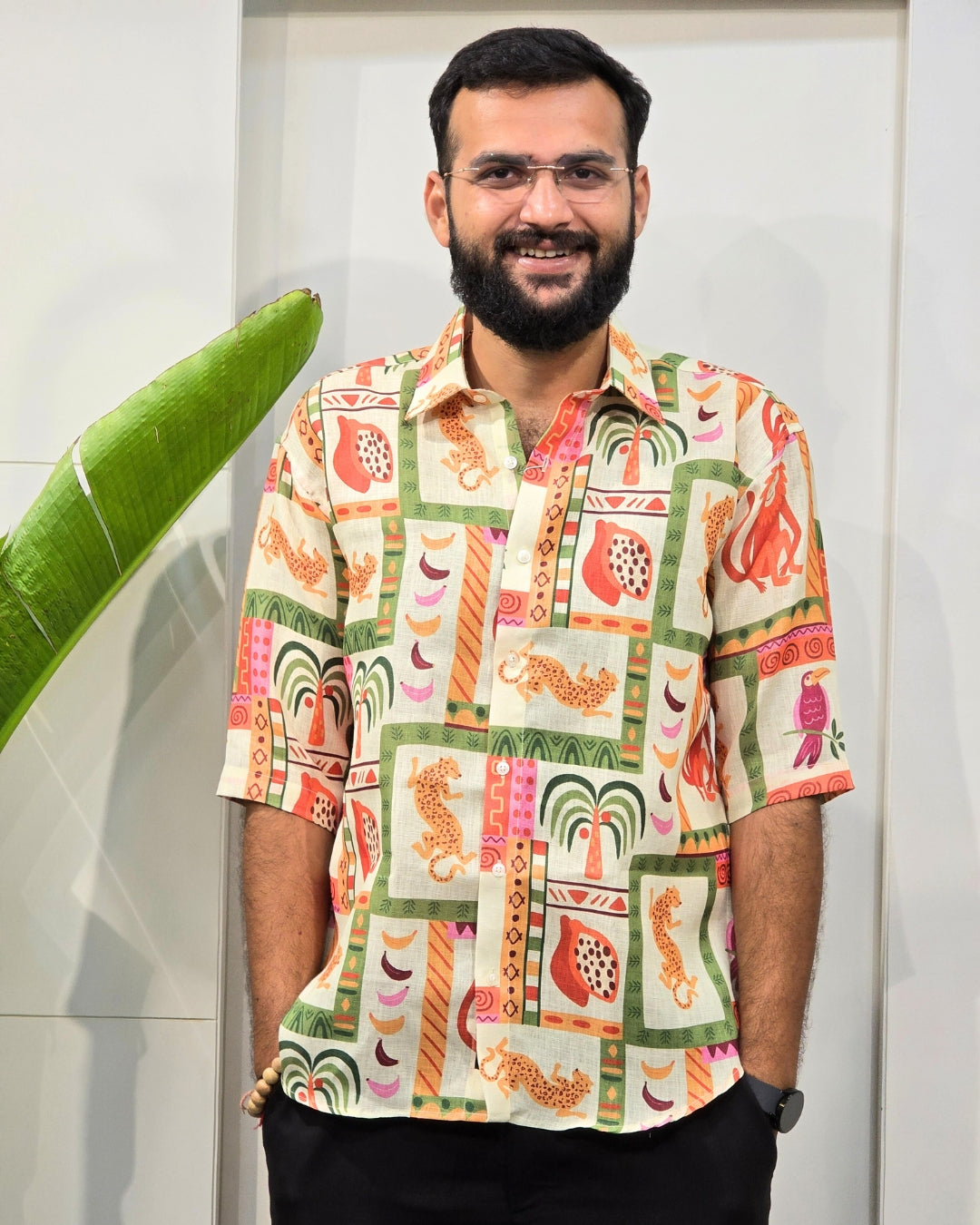 Step into the untamed beauty of nature with the Safari Chronicles Printed Shirt, featuring a vivid collage of wildlife, tropical elements, and tribal-inspired patterns. This half-sleeve button-down shirt is designed for men who embrace bold prints and adventurous style. Made from lightweight, breathable linen, it ensures comfort and effortless charm, making it a standout choice for casual and vacation wear.