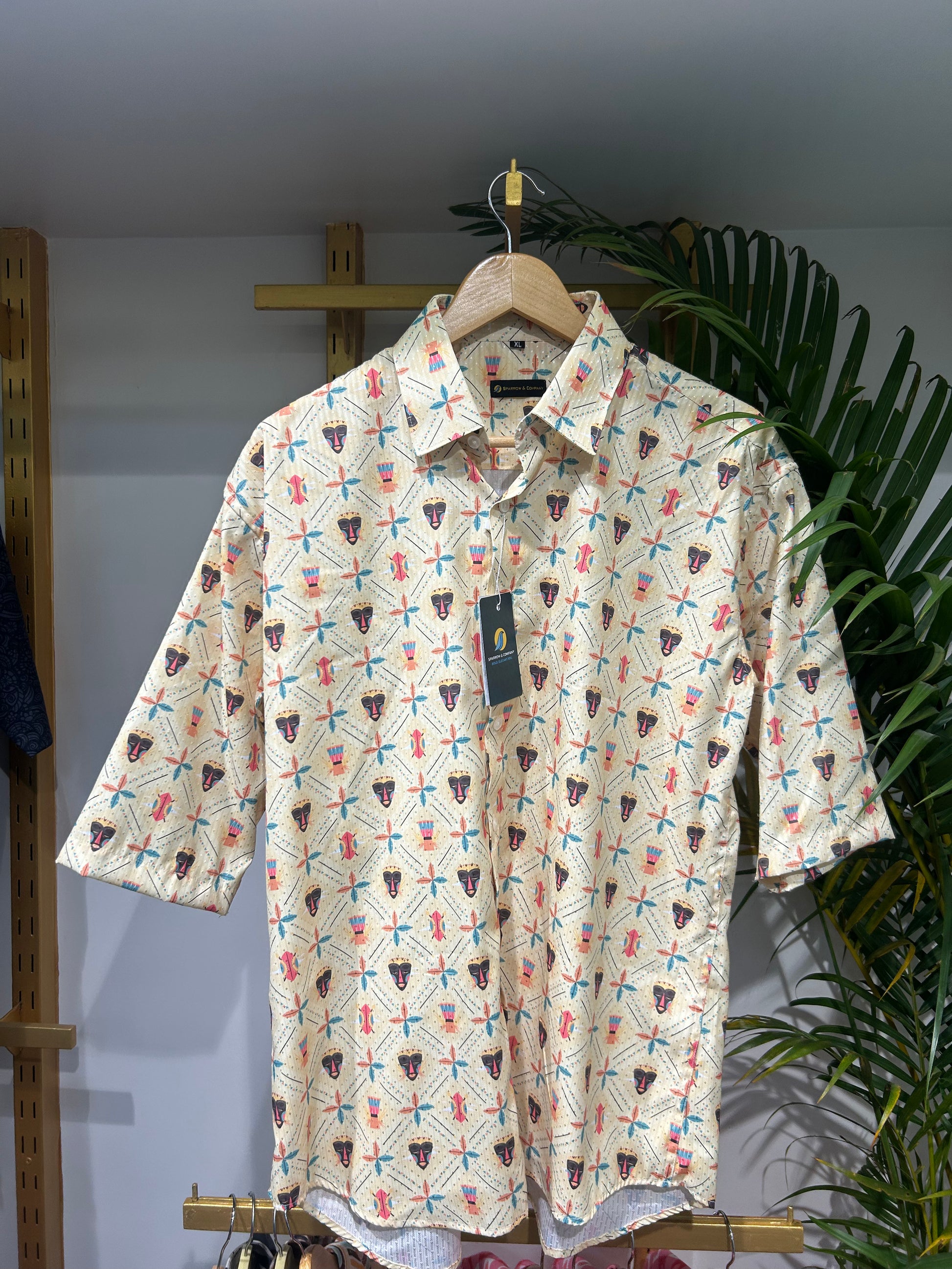 Step into heritage-inspired fashion with the Tribal Mask Print Shirt, a unique blend of traditional tribal artistry and modern style. Featuring intricate tribal mask motifs with geometric accents on a warm beige base, this half-sleeve button-down shirt is perfect for men who love to embrace culture, bold patterns, and individuality. Crafted from premium breathable cotton, it ensures comfort and effortless style for any occasion.
