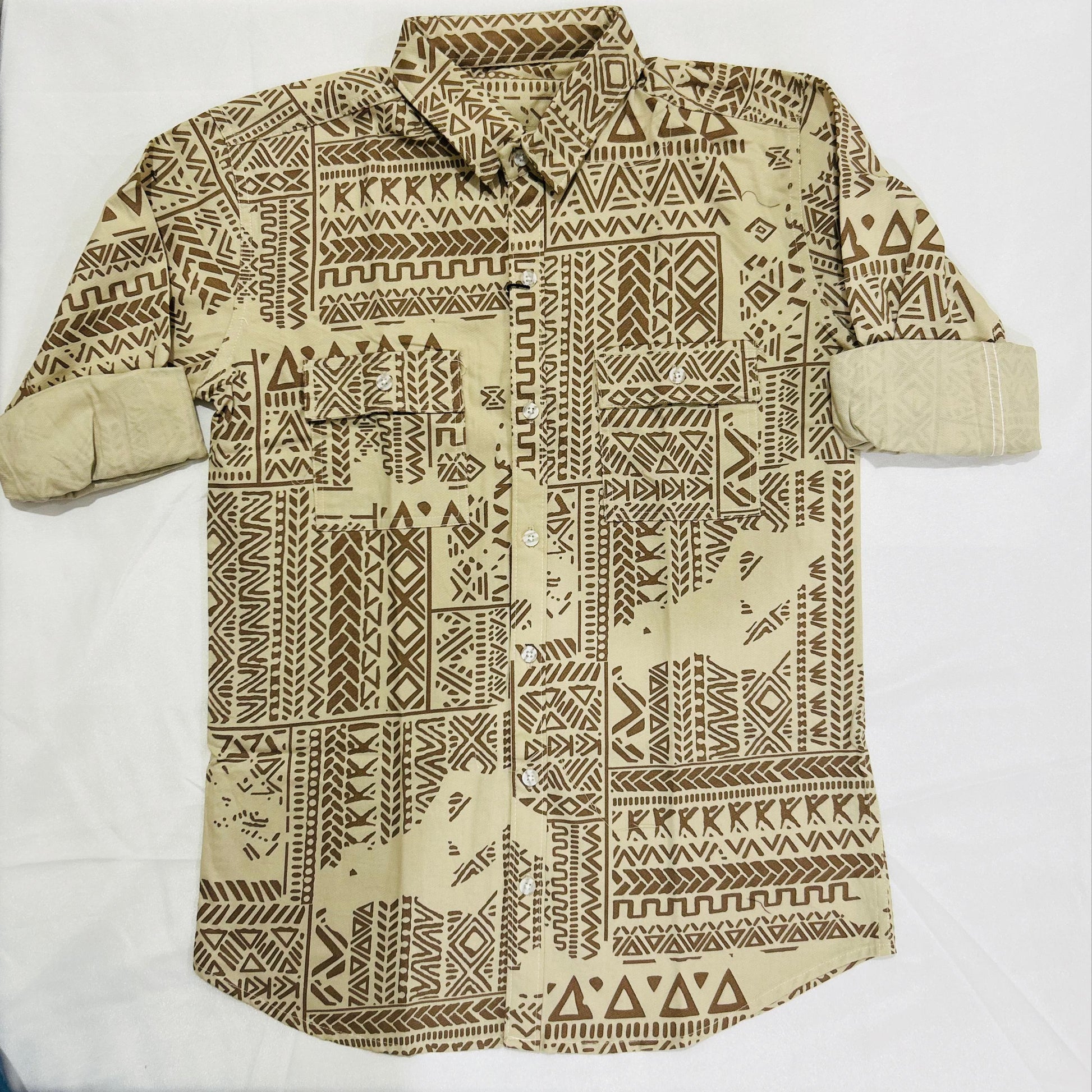 A bold, geometric tribal print shirt inspired by ancient patterns and modern minimalism. The warm beige base with dark brown symmetrical tribal motifs gives it an earthy, organic feel. The button-down structure with double chest pockets adds a rugged charm, while the roll-up sleeve option makes it versatile for casual and semi-formal styling. Perfect for those who appreciate heritage-inspired fashion with a contemporary edge.